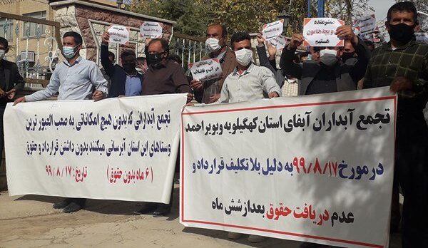 به گزارش حقوق بشر در ایران به نقل از ایسنا، امروز یکشنبه ۱۸ آبان ماه ۱۳۹۹، جمعی از آبداران شاغل در شرکت آبفا استان کهگیلویه و بویر احمد در اعتراض به پرداخت نشدن حقوق و سار مطالبات مزدی آنها در مقابل ساختمان این شرکت تجمع اعتراضی برگزار کردند.