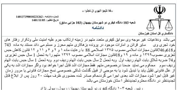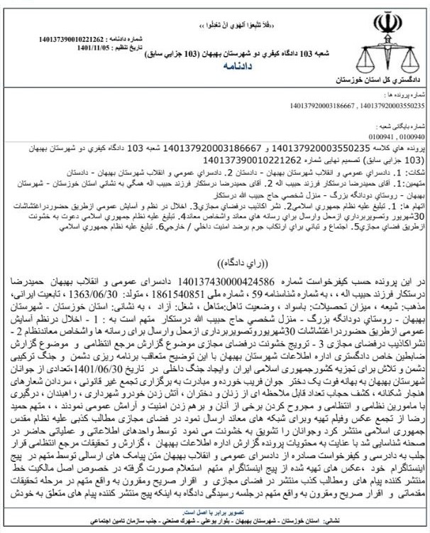 همچنین، حمیدرضا درستکار، در بخش دوم از همین پرونده توسط شعبه ۱۰۳ دادگاه کیفری ۲ شهرستان بهبهان، به ریاست قاضی رسول رسولی نژاد، محاکمه و از بابت اتهام (اخلال در نظم و آسایش عمومی)، به تحمل ۱ سال حبس تعزیری و ۷۴ ضربه شلاق، به اتهام (دعوت به خشونت ازطریق فراخوان فضای مجازی) به تحمل ۱سال حبس و از بابت اتهام (نشر اکاذیب در فضای مجازی) هم به تحمل ۲ سال حبس محکوم و حکم صادره در تاریخ ۵ بهمن ما ۱۴۰۱، در زندان شهرستان بهبهان به حمید درستکار ابلاغ شد.