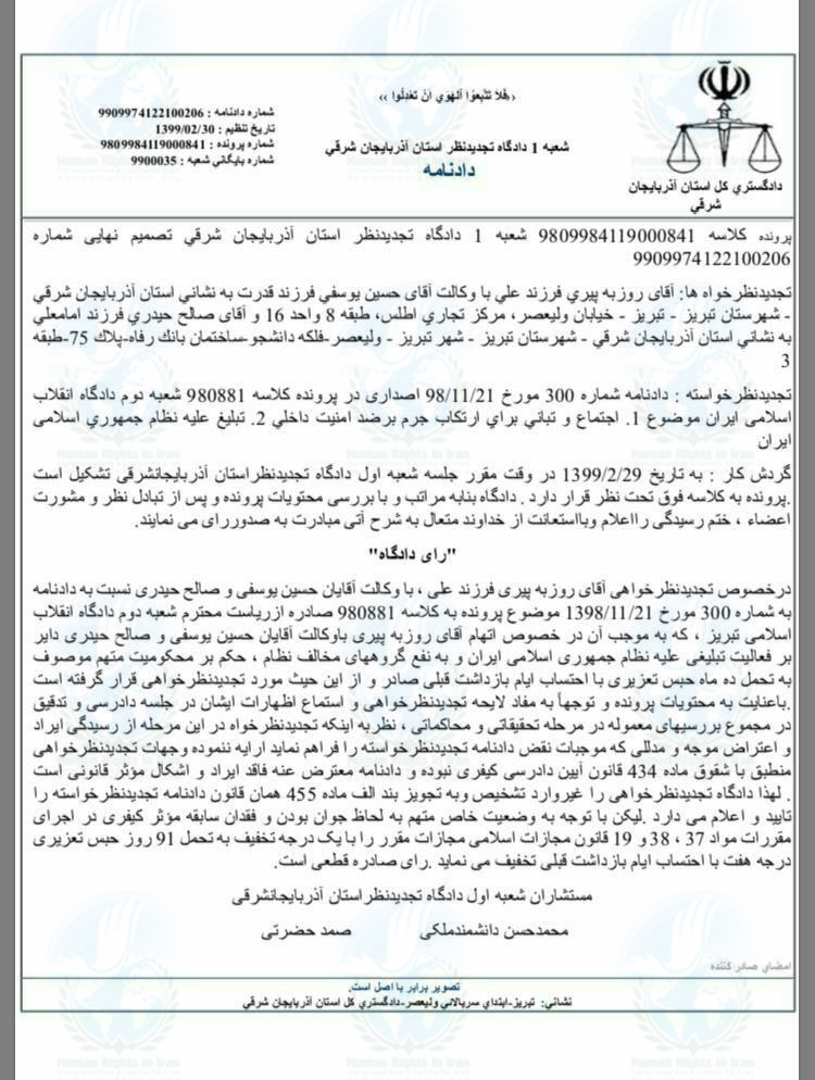 به گزارش حقوق بشر در ایران, امروز پنجشنبه ۱ خردادماه ۱۳۹۹, روزبه پیری, شهروند ساکن تبریز و از بازداشت شدگان تجمعات اعتراضی آبان ماه ۱۳۹۸, توسط شعبه ۱ دادگاه تجدیدنظر استان آذربایجان شرقی به ریاست صمد حضرتی و مستشاری محمدحسین دانشمند ملکی از بابت اتهام “فعالیت تبلیغی علیه نظام”, به تحمل ۹۱ روز حبس تعزیری محکوم شد.