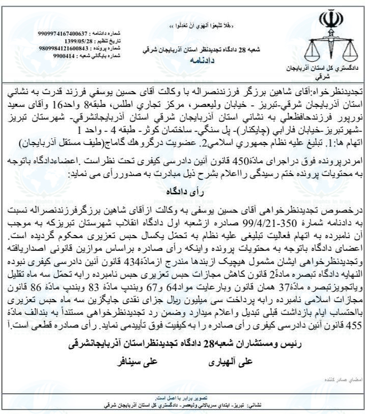 حقوق بشر در ایران – امروز جمعه ۷ شهریور ماه ۱۳۹۹, شعبه ۲۸ دادگاه تجدیدنظر استان آذربایجان شرقی به ریاست علی الهیاری, با صدور دادنامه ای شاهین برزگر, فعال ملی مدنی و از بازداشت شدگان اعتراضات آبان ۱۳۹۸ را به پرداخت ۳۰ میلیون ریال جریمه نقدی بدل از ۳ ماه تحمل حبس تعزیری محکوم کرد.