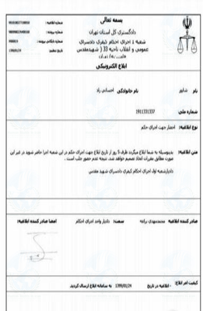 براساس ابلاغیه صادره از سوی محمدمهدی براعه, دادیار شعبه ۱ اجرای احکام کیفری دادسرای امنیت تهران از شاپور احسانی راد خواسته ظرف مدت ۵ روز کاری از زمان ابلاغ احضاریه مذکور در حمل شعبه مذکور برای اجرای حکم حبس حاضر شود و در صورت عدم حضور این فعال کارگری جلب خواهد شد.
