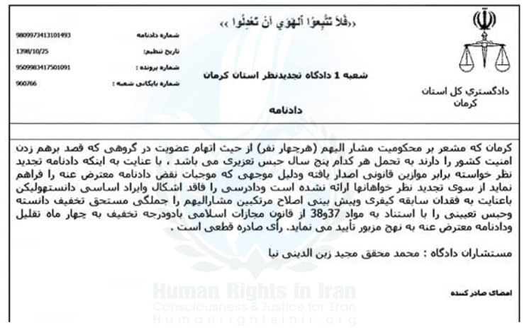 براساس دادنامه صادره توسط شعبه ۱ دادگاه تجدید نظر استان کرمان: “دادگاه با استناد به مفاد ۳۷ و ۳۸ از قانون مجازات اسلامی با ۲ درجه تخفیف, احسان الله امیری نیا، نیما رجب زاده ، آرمان بندی امیرآباد و امراله خالقیان, چهار تن از شهروندان بهائی ساکن استان کرمان را از بابت اتهام اقدام علیه امنیت داخلی کشور از طریق تبلیغ بهائیت مدت محکومیت صادره بر علیه این ۴ شهروند بهائی را از ۵ سال برای هر نفر به ۴ ماه حبس تعزیری برای هر یک از این افراد تقلیل داد”.