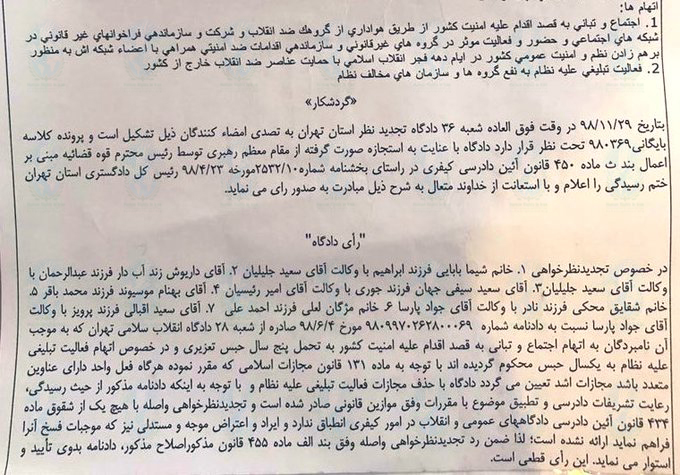براساس دادنامه صادره از سوی شعبه ۳۶ دادگاه تجدید نظر استان تهران, سعید سیفی جهان, بهنام موسیوند, سعید اقبالی, داریوش زند, شیما بابائی, شقایق محکی و مژگان لعلی, در یک دادنامه هر یک از بابت اتهام “اجتماع و تبانی به قصد اقدام علیه امنیت کشور” به تحمل ۵ سال حبس تعزیری و همچنین از بابت اتهام “فعالیت تبلیغی علیه نظام” هم هر یک از این فعالان مدنی به تحمل ۱ سال حبس تعزیری محکوم شدند.