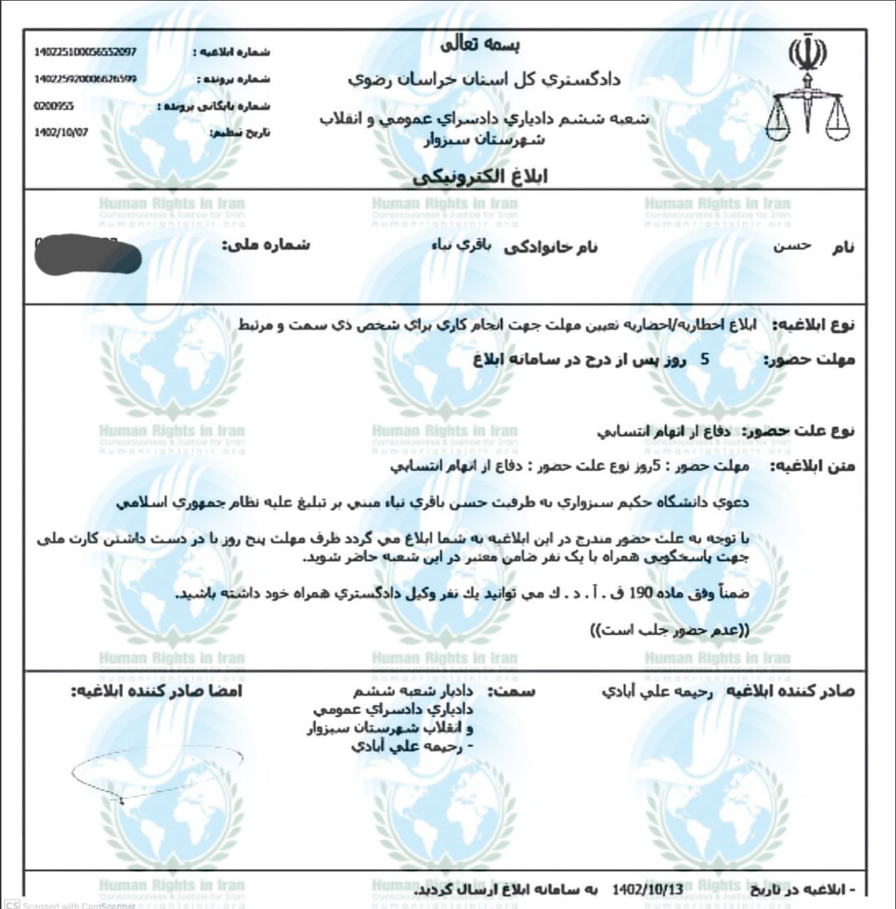 براساس ابلاغیه صادره توسط رحیمه علی آبادی ـ دادیار شعبه ۶ دادیاری دادسرای عمومی و انقلاب شهرستان سبزوار که در تاریخ ۷ دی ماه ۱۴۰۲، صادر و از طریق سامانه ثنا(ابلاغی الکترونیک قوه قضائیه) برای این شهروند اراسل شده؛ حسن باقری نیا، باید ضرف مدت ۵ روز پس از درج در سامانه ایلاغ، برای ارائه دفاعیات خود از بابت اتهام (فعالیت تبلیغی علیه نظام در فضای مجازی) به آن دادسرا مراجعه کند.