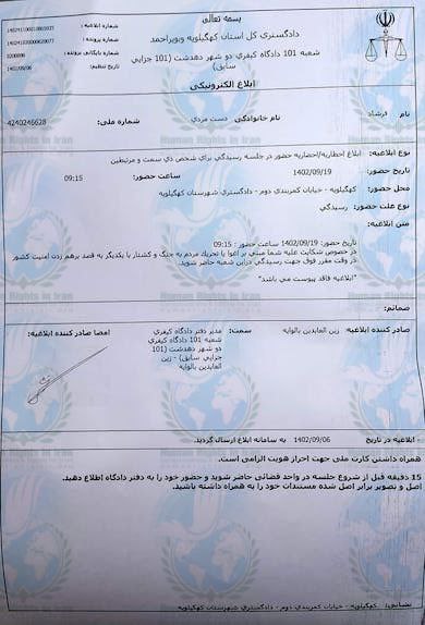 به گزارش حقوق بشر در ایران، امروز دوشنبه ۱۸ دی ماه ۱۴۰۲، فرشاد دست مردی، اهل و ساکن شهرستان دهدشت از توابع استان کهگیلویه و بویراحمد، با دریافت ابلاغیه ای کتبی برای محاکه از بابت اتهام تفهیم شده به شعبه ۱۰۱ دادگاه کیفری ۲ شهرستن دهدشت از توابع استان کهگلویه و بویراحمد احضار شد.