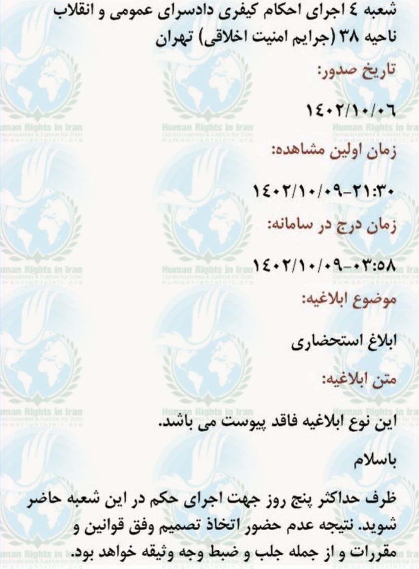 به گزارش حقوق بشر در ایران، امروز دوشنبه ۱۸ دی ماه ۱۴۰۲، محمد صادقی، ساکن تهران، با دریافت ابلاغیه ای کتبی از سوی قاضی شعبه ۴ اجرای احکام دادسرای ناحیه ۳۸(جرائم اخلاقی) تهران، برای تحمل حبس تعزیری ۵ ساله خود احضار شد.