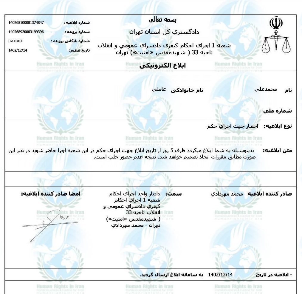 براساس ابلاغیه کتبی صادره توسط محمد مهردادی ـ دادیار شعبه اول اجرای احکام دادسرای ناحیه ۳۳تهران که از طریق سامانه (ثنا) برای محمدعلی(جمال)عاملی ارسال شده وی باید در تاریخ ۵ فروردین ماه ۱۴۰۲، برای اجرای حکم حبس تعریری خود به آن دادسرا مراجعه کند.