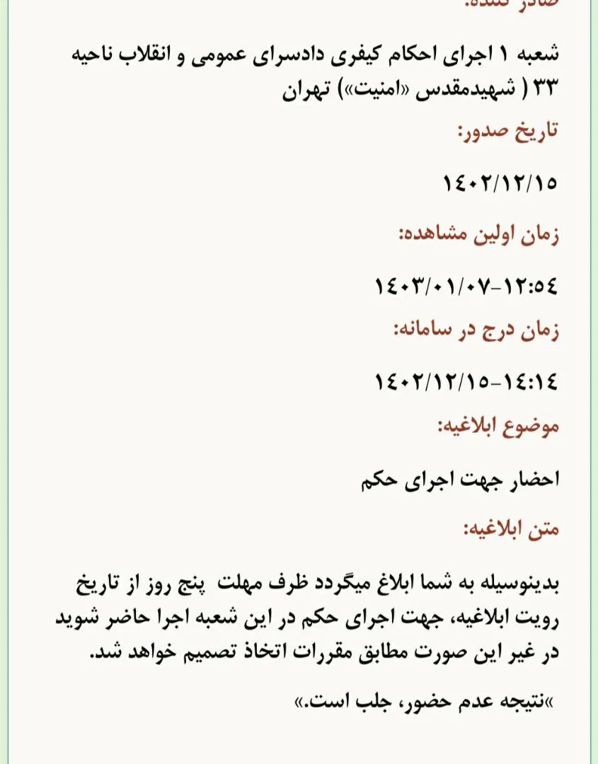 ضیا نبوی، با اعلام این خبر در صفحه شخصی خود نوشت:”دوباره احضاریه ای از اجرای حکم برایمان آمد و دو هفته مانده به عید و چند روز بعد انتخابات مجلس. طبق معمول گفته بودند در عرض پنج روز خودمان را معرفی کنیم وگرنه دستور جلب صادر میشود. وکلا رفتند و صحبت کردند و قرار شد که بعد تعطیلات خودمان را معرفی کنیم و روز شنبه ۱۸ فروردین ماه ۱۴۰۳ در اجرای احکام اوین خواهیم بود.”