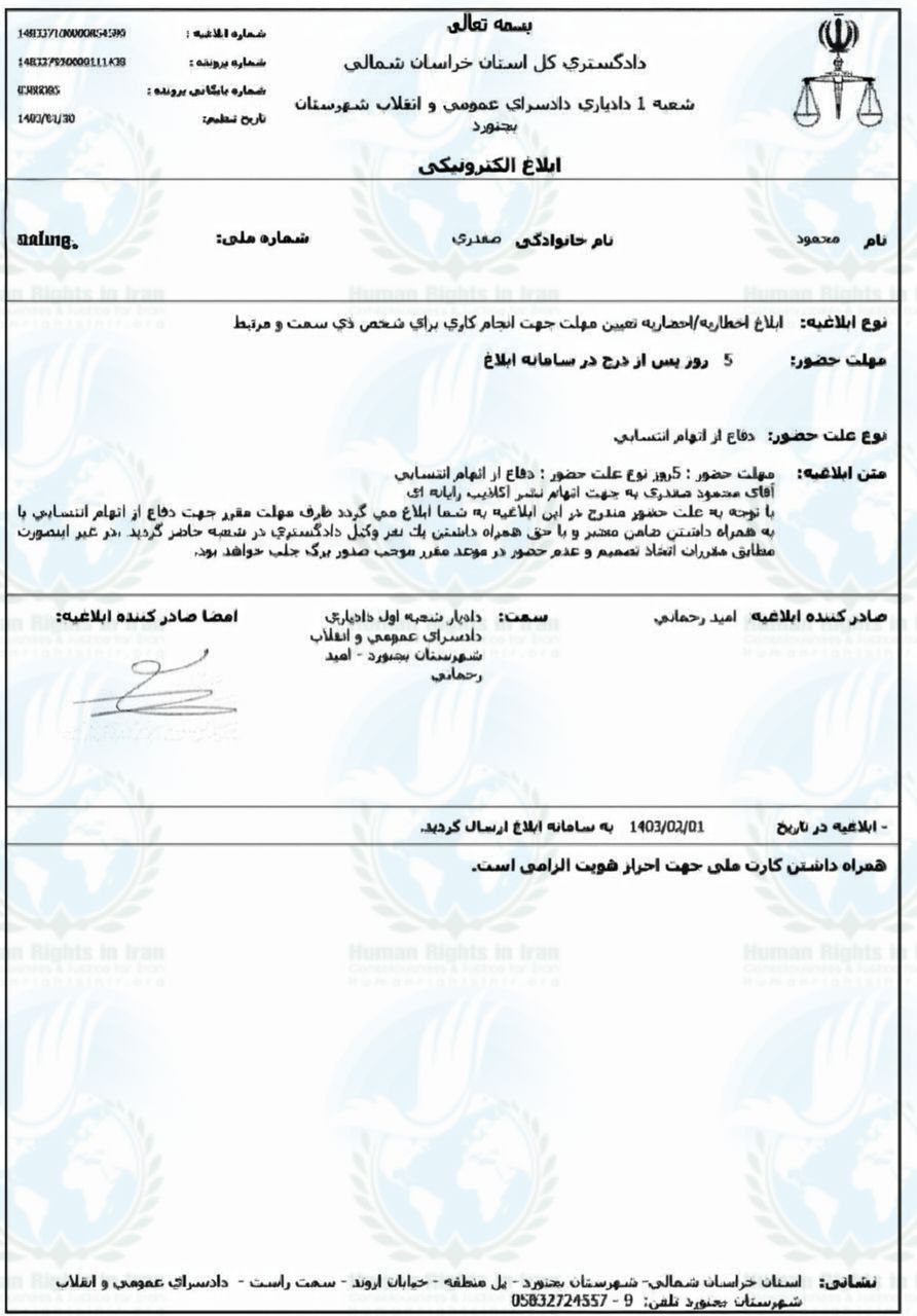 بر اساس ابلاغیه ای که توسط امید رحمانی ـ دادیار شعبه اول دادسرای عمومی و انقلاب شهرستان بجنورد در تاریخ ۱ اردیبهشت ماه ۱۴۰۳، صادر شده محمود صفدری باید ظرف مدت ۵ روز، برای ارائه دفاعیات خود از بابت اتهام (نشر اکاذیب در فضای مجازی) در آن جلسه بازپرسی حاضر شود.