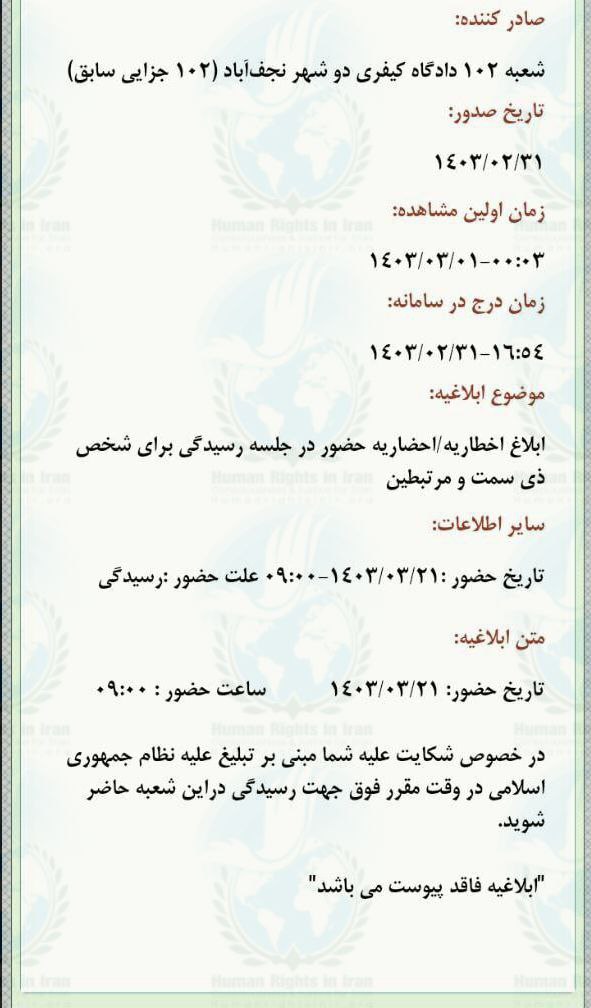 حقوق بشر در ایران ـ امروز جمعه ۴ خرداد ماه ۱۴۰۳، ایرج توبه ایها، به شعبه ۱۰۲ دادگاه کیفری۲ نجف آباد احضار شد.