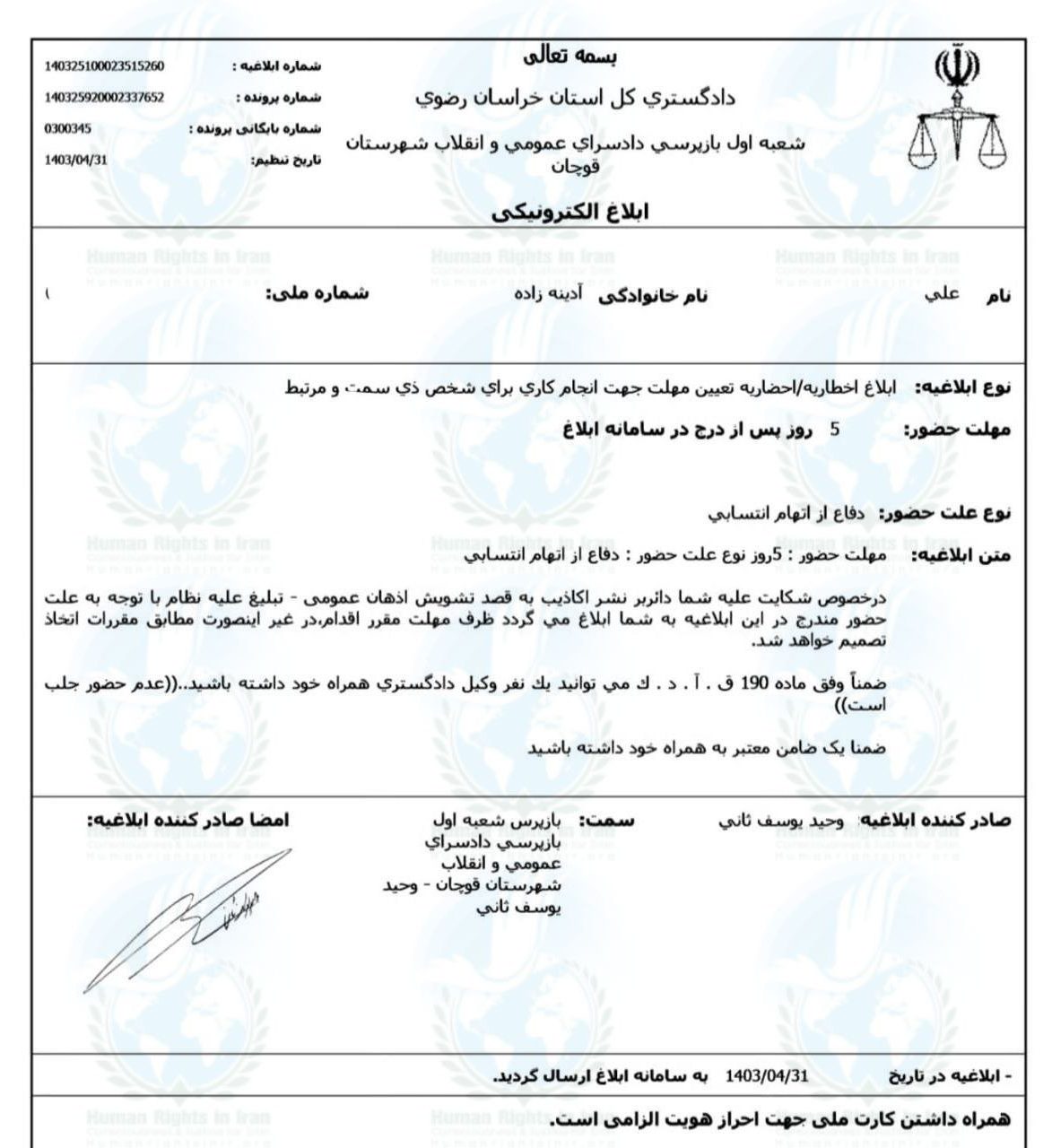 براساس ابلاغیه صادره مقررش ده تا علی آدینه زاده برای ارائه دفاعیات خود در برابر اتهامات «نشر اکاذیب»، «تشویش اذهان عمومی» و «تبلیغ علیه نظام» ظرف مدت ۵ روز در شعبه اول بازپرسی دادسرای عمومی و انقلاب شهرستان قوچان حاضر شود.