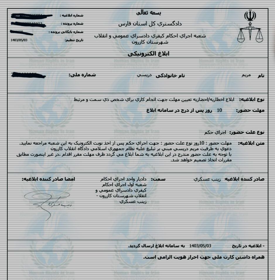 حقوق بشر در ایران ـ امروز پنجشنبه ۴مرداد ماه ۱۴۰۳، مریم دریس برای تحمل حبس احضار شد.