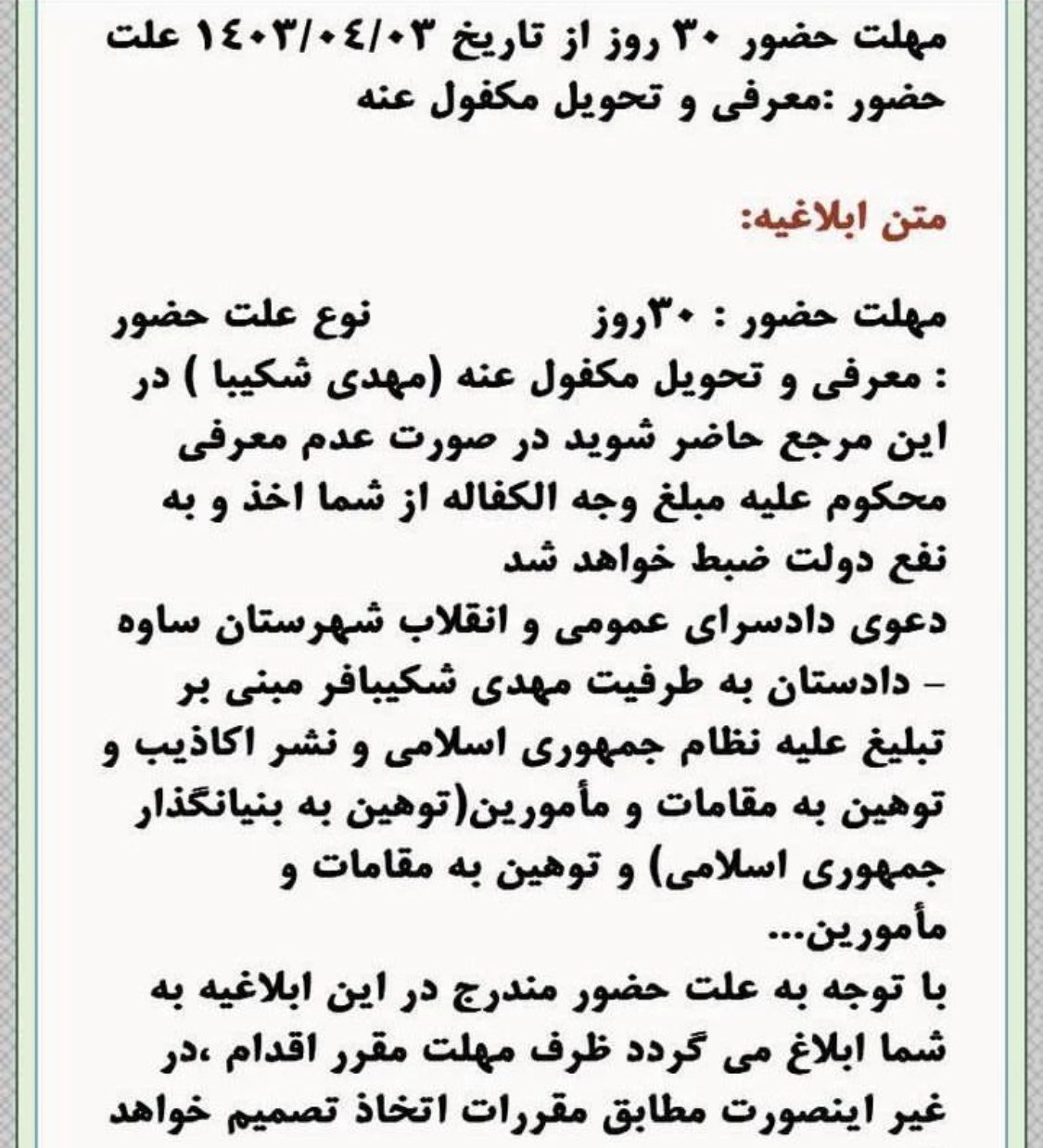 براساس ابلاغیه صادره که از طریق سامانه ابلاغ الکترونیک «ثنا» برای مهدی شکیبافر ارسال شده این وکیل دادگستری، باید از تاریخ ۳ مرداد ماه ۱۴۰۳، ظرف مدت ۳۰ روز برای سپری کردن دوران حبس تعزیری خود در آن شعبه اجرای احکام حاضر شود.