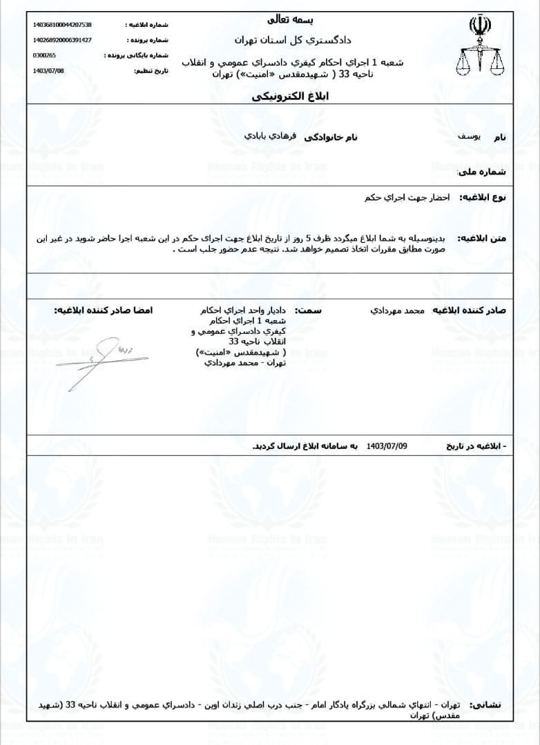 امروز دوشنبه ۹مهر ماه ۱۴۰۳، یوسف فرهادی بابادی، برای اجرای حکم حبس تعزیری خود احضار شد.