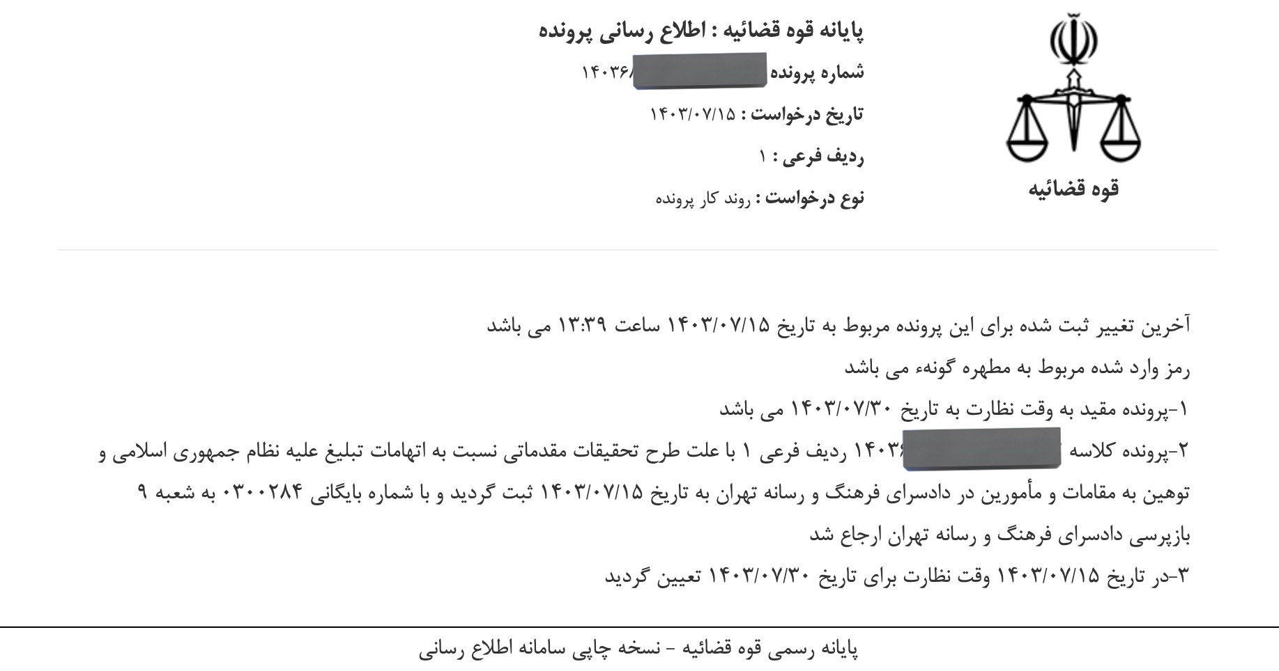 حقوق بشر در ایران ـ امروز یکشنبه ۱۵ مهر ماه ۱۴۰۳، مطهره گونه ای به شعبه بازپرسی در دادسرای فرهنگ و رسانه تهران، احضار شد.