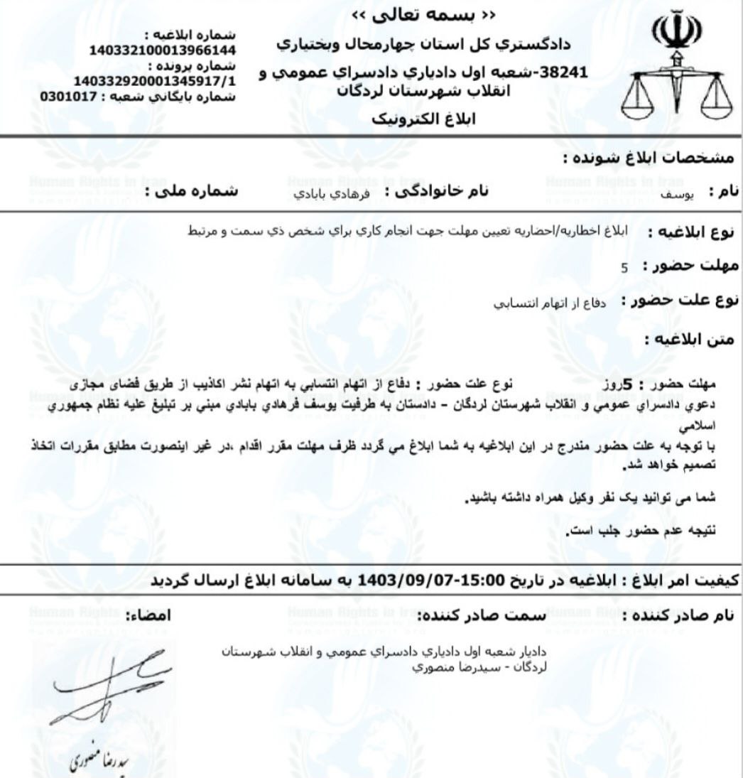 براساس ابلاغیه صادره توسط سیدرضا منصوری ـ دادیار شعبه اول دادسرای عمومیو انقلاب شهرستان لردگان، که از طریق سامانه ابلاغ الکترونیک قوه قضائیه(ثنا) برای یوسف فرهادی بابادی ارسال شده این فعال مدنی باید طرف مدت ۵ روز برای ارائه دفاعیات آخر خو پیش از تنظیم کیفرخواست در برابر اتهام «نشر اکاذیب در فضای مجازی» و «تبلیغ علیه نظام در فضای مجازی» در آن جلسه بازپرسی، حاضر شود.