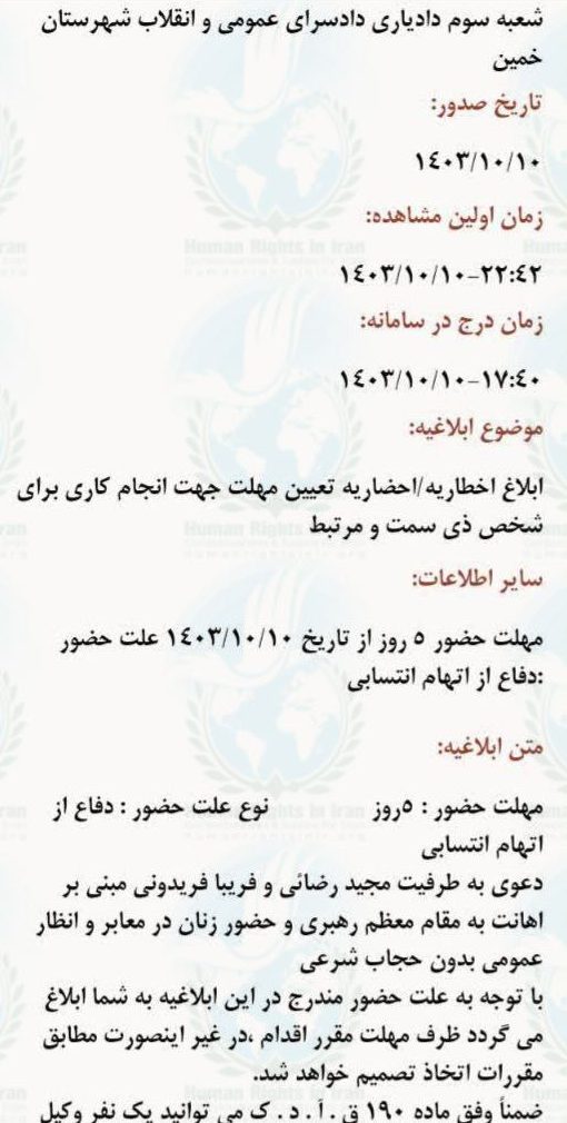 حقوق بشر در ایران ـ امروز چهارشنبه ۱۲دی ماه ۱۴۰۳، فریبا فریدونی و مجید رضایی به شعبه بازپرسی، احضار شدند.