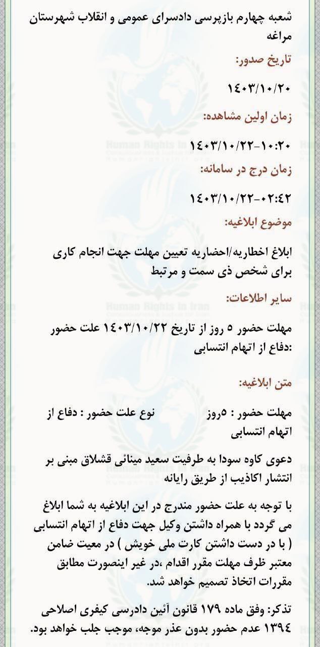به گزارش حقوق بشر در ایران، طی روزهای اخیر، سعید مینایی قشلاق، فعال ملی مدنی، ساکن شهرستان مراغه از توابع استان آذربایجان غربی، برای تشکیل پرونده قضایی جدید به شعبه ۴ بازپرسی دادسرای عمومی و انقلاب مراغه، احضار شد.