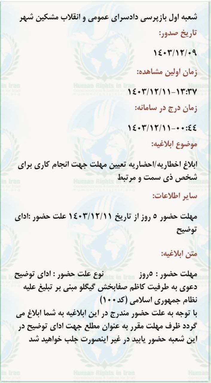 به گزارش حقوق بشر در ایران، روز پنجشنبه ۹ اسفند ماه ۱۴۰۳، کاظم صفابخش، فعال ملی مدنی، ساکن شهرستان مشکین شهر از توابع استان آذربایجان شرقی، با دریافت ابلاغیه ای کتبی به شعبه اول بازپرسی دادسرای عمومی و انقلاب آن شهرستان، احضار شد.