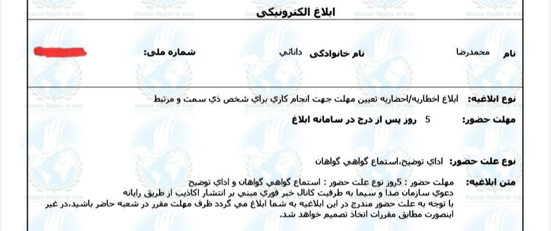 حقوق بشر در ایران ـ امروز پنجشنبه ۱۶ اسفند ماه ۱۴۰۳، محمدرضا دانایی، به دادسرا احضار شد.