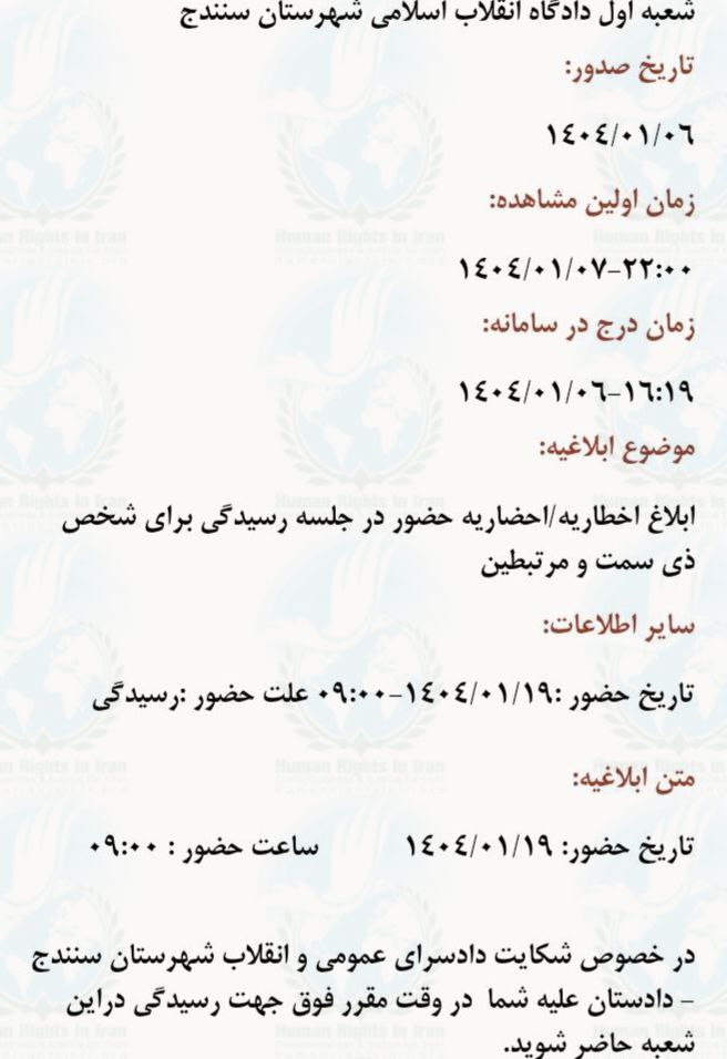 به گزارش حقوق بشر در ایران به نقل از اتحادیه آزاد کارگران ایران، روز چهارشنبه ۶ فروردین ماه ۱۴۰۴، شیث امانی، فرشید عبداللهی، اقبال شبانی، جمال اسدی و آرمان سلیمی، پنج تن از فعالان کارگری ساکن شهر سنندج مرکز استان کردستان به شعبه اول دادگاه انقلاب آن شهر احضار شدند.