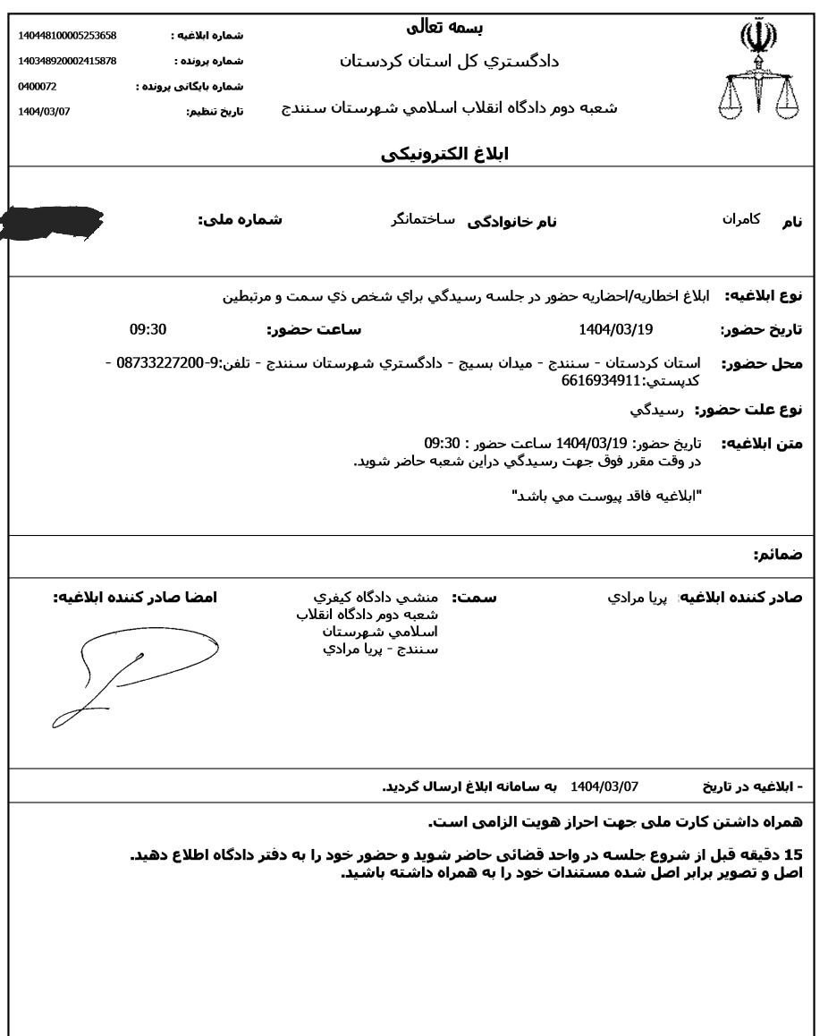 براساس ابلاغیه صادره توسط پریا مرادی ـ منشی دادگاه کیفری و شعبه ۲ دادگاه انقلاب شهر سنندج، کامران ساختمانگر، باید در تاریخ ۱۹ خرداد ماه ۱۴۰۴، برای ارائه دفاعیات خود در برابر اتهام«فعالیت تبلیغی علیه نظام» در شعبه ۲ دادگاه انقلاب سنندج، حاضر شود.
