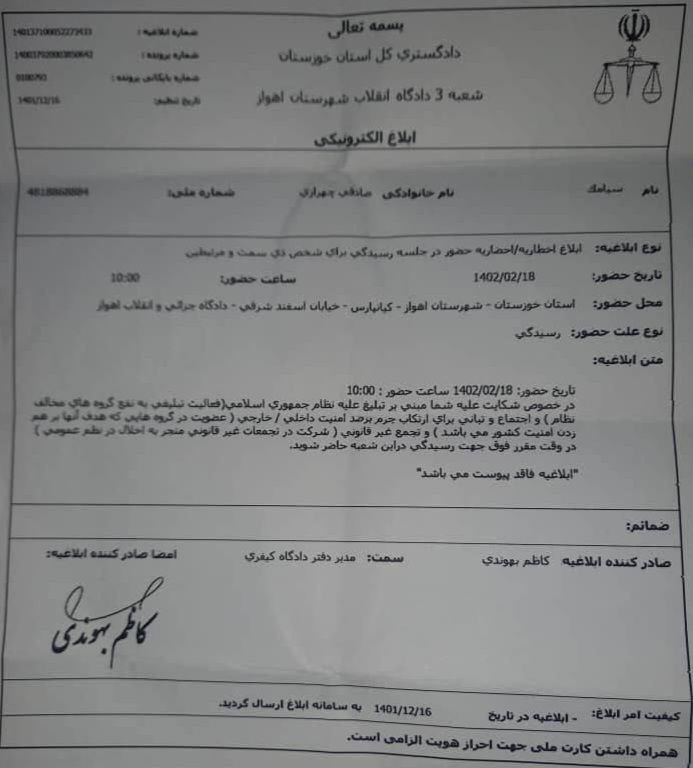 براساس ابلاغیه صادره توسط کاظم بهوندی، مدیر دفتر دادگاه کیفری اهواز، مقرر شده تا سیامک صادقی چهرازی، در تاریخ ساعت ۱۰ صبح ۱۸ اردیبهشت ماه ۱۴۰۲، جهت ارائه دفاع از بابت اتهامات (فعالیت تبلیغی به نفع گروه های مخالف نظام)، (اجتماع و تبانی به قصد ارتکاب جرم بر ضد امنیت داخلی / خارجی)، (عضویت در گروههای مخالف نظام به قصد برهم زدن امنیت کشور) و (اخلال در نظم عمومی از طرق شرکت در تجمع غیرقانونی) به شعبه ۳ دادگاه انقلاب اهوتز مراجعه کند.