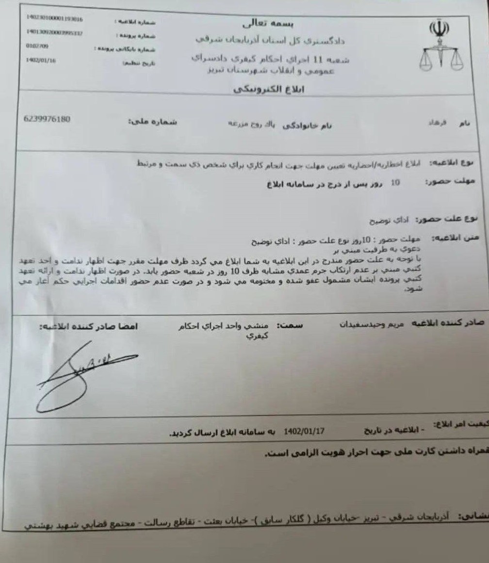 حقوق بشر در ایران ـ امروز جمعه ۱۸ فروردین ماه ۱۴۰۲، شعبه ۱۱ اجرای احکام کیفری دادسرای عمومی و انقلاب شهر تبریز مرکز استان آذربایجان غربی، فرهاد پاکروح مزرعه را احضار کرد.