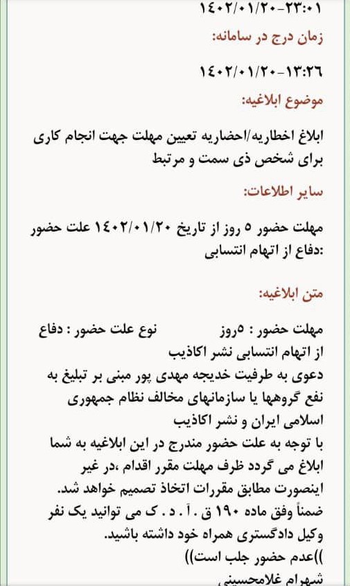 حقوق بشر در ایران ـ امروز چهارشنبه ۲۳ فروردین ماه ۱۴۰۲، شعبه بازپرسی دادسرای عمومی و انقلاب استان ایلام با ارسال ابلاغیه ای خدیجه مهدی پو را احضار کرد.