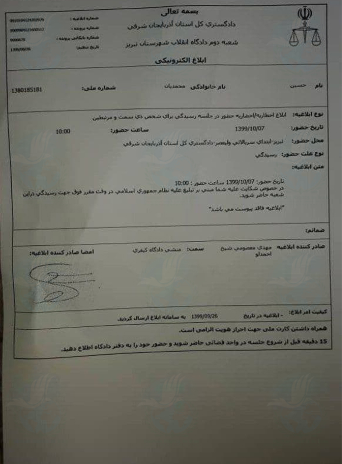 این فعال ملی مدنی با دریافت ۲ ابلاغیه کتبی از طریق سامانه ابلاغ قوه قضائیه « ثنا » به این جلسات دادرسی احضار شده است.