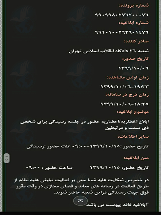حقوق بشر در ایران – امروز پنجشنبه ۱۱ دی ماه ۱۳۹۹، شعبه ۲۶ دادگاه انقلاب تهران به ریاست ایمان افشاری با ارسال پیامک و ابلاغیه ای کتبی مریم سامقانی، فعال مدنی مشروطه خواه را جهت حضور در جلسه دادرسی فراخواند.