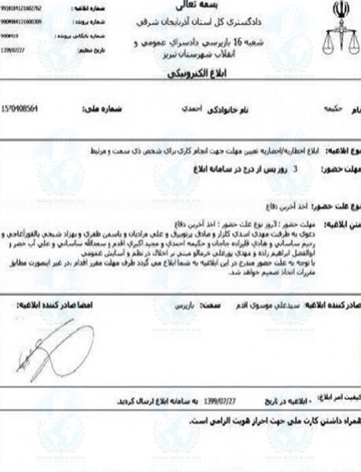 به گزارش حقوق بشر در ایران، امروز سه شنبه ۲۹ مهر ماه ۱۳۹۹، حکیمه احمدی، فعال ملی مدنی ساکن شهرستان مرند، با دریافت ابلاغیه ای کتبی توسط شعبه ۱۶ بازپرسی دادسرای عمومی و انقلاب تبریز جهت حضور در جلسه بازپرسی و تفهیم اتهام اخلال در نظم عمومی احضار شد.