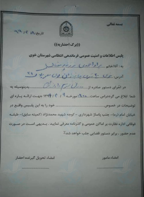 حقوق بشر در ایران – امروز یکشنبه ۸تیرماه ۱۳۹۹, پلیس اطلاعات و امنیت شهرستان خوی با ارسال احضاریه ای جواد احمدی یئکانلی, فعال ملی مدنی ساکن این شهرستان به آن اداره فراخواند.