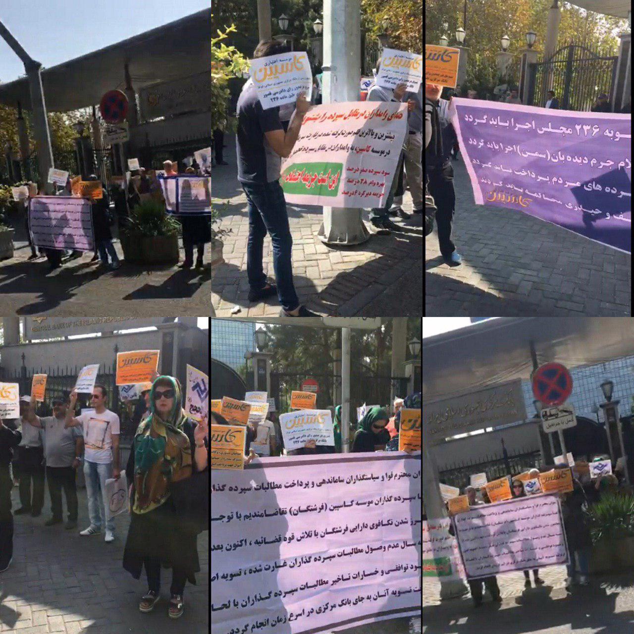 به گزارش حقوق بشر در ایران, امروز دوشنبه ۲۲ مهر ماه ۱۳۹۸، جمعی از مالباختگان موسسه مالی و اعتباری کاسپین و موسسه مالی و اعتباری ثامنالحجج در مقابل ساختمان بانک مرکزی در تهران و اعتراض به از دست رفتن سپرده های بانکی این افراد تجمع اعتراض برگزار کردند.