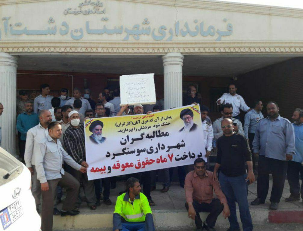 به گزارش حقوق بشر در ایران بنقل از اتحادیه آزاد کارگران ایران، امروز چهارشنبه ۱۹شهریور ماه ۱۳۹۹، جمعی از کارگران شهرداری شهرستان سوسنگرد در اعتراض به پرداخت نشدن حقوق و سایر و مطالبات مزدی و صنفی آنها در مقابل ساختمان فرمانداری این شهر تجمع اعتراضی برگزار کردند.