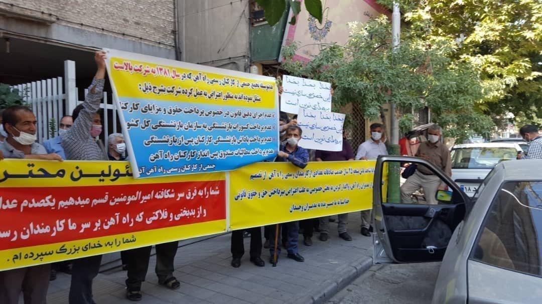 به گزارش حقوق بشر در ایران بنقل از کانال تلگرامی کارگران و کارکنان نگهداری خط و ابنیه فنی راه آهن, امروز پنجشنبه ۲۳مرداد ۱۳۹۹, جمعی از کارگران و کارمندان واحد نگهداری خط و ابنیه فنی راه آهن در ایستگاه تهران که تعمیر و نگهداری خطوط ریلی را برعهده دارند در اعتراض به پرداخت نشدن مطالبات مزدی آنها در مقابل یکی از ساختمانهای اداری راه آهن تهران تجمع اعتراضی برگزار کردند.