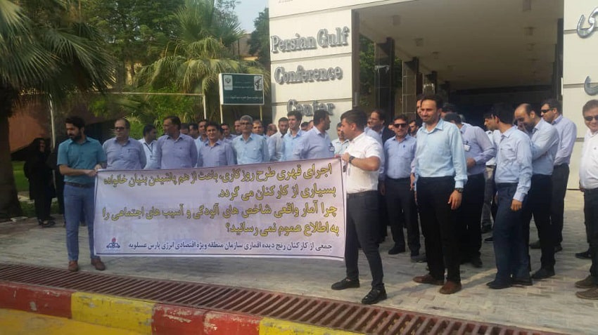 به گزارش حقوق بشر در ایران، امروز دوشنبه ۳۱ تیر ۱۳۹۸، جمعی از کارکنان منطقه ویژه اقتصادی انرژی پارس عسلویه برای دومین بار در اعتراض به قطع فوق العاده “اقماری کاری” خود، دست از کار کشیدند و مقابل ساختمان مرکزی منطقه ویژه، دست به تجمع اعتراضی زدند.