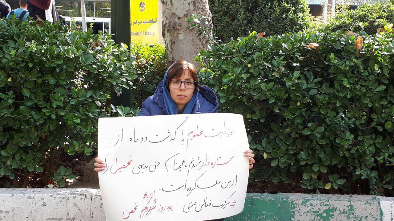 به گزارش حقوق بشر در ایران, امروز دوشنبه ۱۳ آبان ماه ۱۳۹۸, سها مرتضایی, دانشجوی محروم از تحصیل که با رتبه ۱۰ کنکور سراسری به دلیل فعالیتهای صنفی دانشجویی ستارهدار شد پانزدهمین روز تحصن اعتراضی خود را در مقابل دانشگاه تهران برگزار کرد.