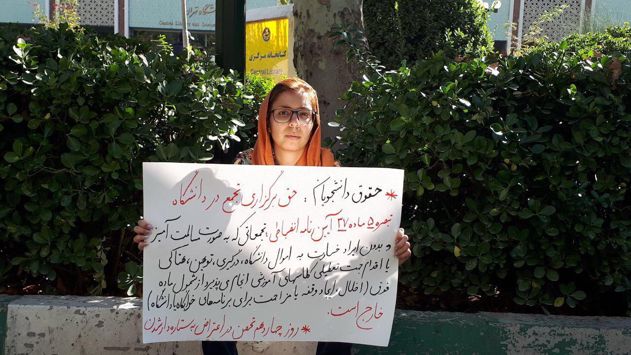 به گزارش حقوق بشر در ایران, امروز یکشنبه ۱۲آبانماه ۱۳۹۸، سها مرتضایی, دانشجوی محروم از تحصیل که با رتبه ۱۰ کنکور سراسری به دلیل فعالیتهای صنفی دانشجویی ستارهدار شد چهاردهمین روز تحصن اعتراضی خود را در مقابل دانشگاه تهران برگزار کرد.