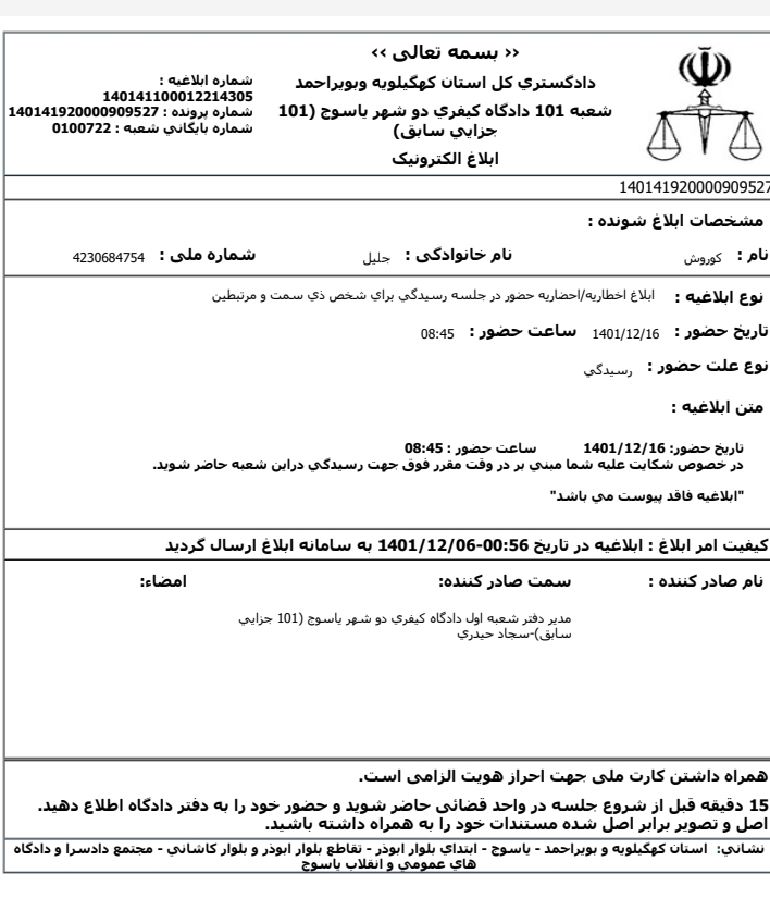 حقوق بشر در ایران – امروز یکشنبه ۷اسفند ماه ۱۴۰۱، رئیس دفتر شعبه ۱۰۱ دادگاه کیفری ۲ شهر یاسوج با ارسال ابلاغیه ای کتبی، کوروش جلیل را به جلسه واخواهی احضار کرد.