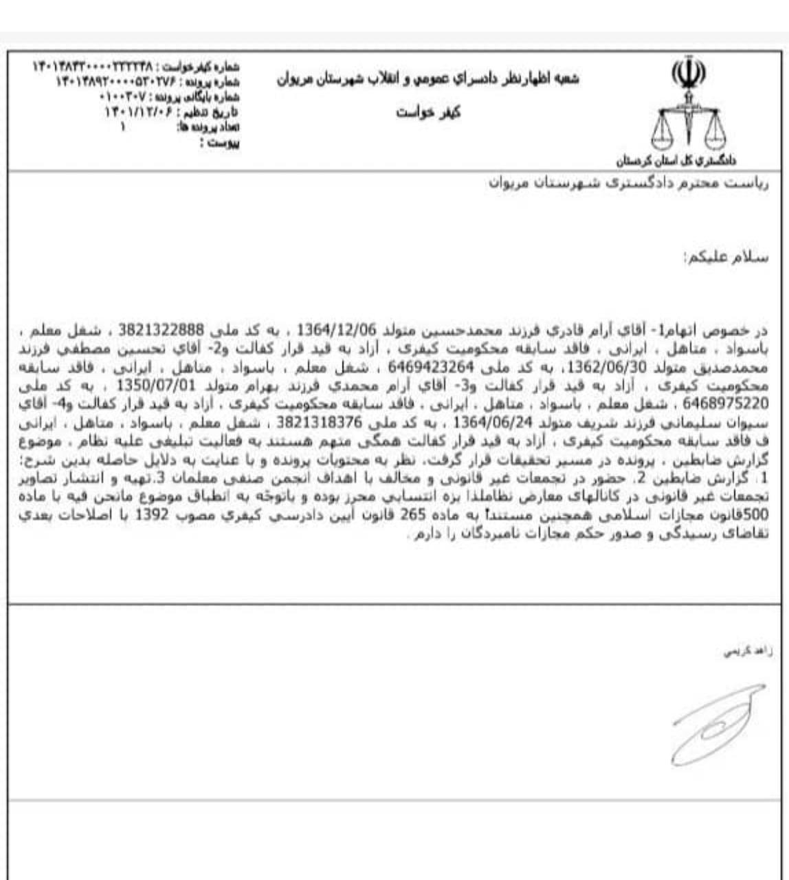 حقوق بشر در ایران ـ امروز پنجشنبه ۳۱ فروردین ماه ۱۴۰۲، پس از تشکیل جلسه بازپرسی و تفهیم اتهام، کیفرخواست ۴ تن از فعالان صنفی فرهنگیان شهرستان مریوان صادر و پرونده آنها به دادگاه ارجاع شد.