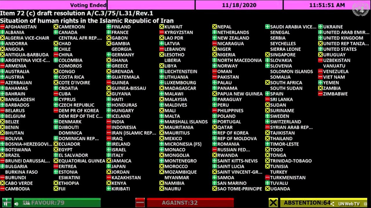 به گزارش حقوق بشر در ایران، امروز چهارشنبه ۲۸ آبان ماه ۱۳۹۹، اعضای کمیته سازمان ملل متحد با ۷۹رأی موافق – ۳۲ رای ممتنع قطعنامه نقض حقوق بشر در ایران را به تصویب رساند. این قطعنامه در حالی به تصویب رسید که جمهوری اسلامی تلاش بسیاری برای رد این قطعنامه انجام داده بود اما به رغم این تلاشها قطعنامه مذکور با اکثریت آرا تصویب شد.