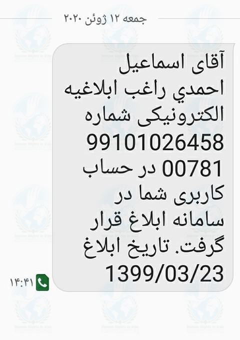 حقوق بشر در ایران – امروز شنبه ۲۴ خرداد ماه ۱۳۹۹, شعبه ۴ اجرای احکام کیفری دادسرای عمومی و انقلاب شهرستان شهریار با ارسال پیامک و ابلاغیه ای در سامانه ابلاغ الکترونیک قوه قضائیه زرتشت احمدی راغب, فعال مدنی ساکن این شهرستان را جهت اجرای حکم احضار کرد.
